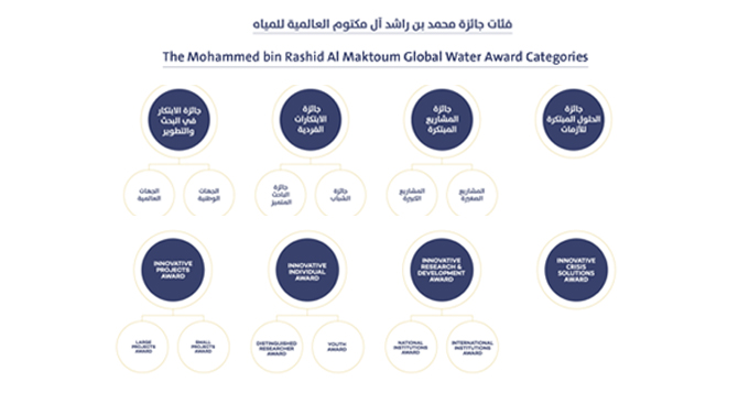 أعلنت مؤسسة "سقيا الإمارات" تحت مظلة مؤسّسة مبادرات محمد بن راشد آل مكتوم العالمية، عن توسيع نطاق الدورة الثالثة من جائزة محمد بن راشد آل مكتوم العالمية للمياه، التي أطلقها صاحب السمو الشيخ محمد بن راشد آل مكتوم، نائب رئيس الدولة رئيس مجلس الوزراء حاكم دبي "رعاه الله"، لتشمل تقنيات جديدة تعمل على إنتاج وتوزيع وتخزين ومراقبة وتحلية وتنقية المياه باستخدام الطاقة المتجددة. كما أضافت المؤسسة جائزة الحلول المبتكرة للأزمات إلى فئات الجائزة الثلاث السابقة: جائزة المشاريع المبتكرة جائزة الابتكارات الفردية جائزة الابتكار في البحث والتطوير، بما يشجع عدد أكبر من المؤسسات البحثية والأفراد للمشاركة في الجائزة التي يبلغ مجموع جوائزها مليون دولار أمريكي، وتهدف إلى إيجاد حلول مستدامة ومبتكرة للتصدّي لمشكلة شُح المياه.