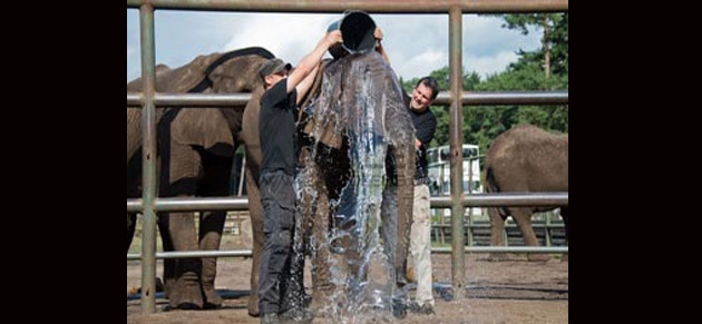 وقام كلا المدربين بسكب دلو من الماء المثلج على الفيل، لتكون أولى المشاركات في تحدي الثلج، في عالم الحيوانات، كما ظهرت في لقطة أخرى وهي تحمل لوحة مكتوب عليها أسماء 3 فيلة قامت بدعوتهم للمشاركة في التحدي.