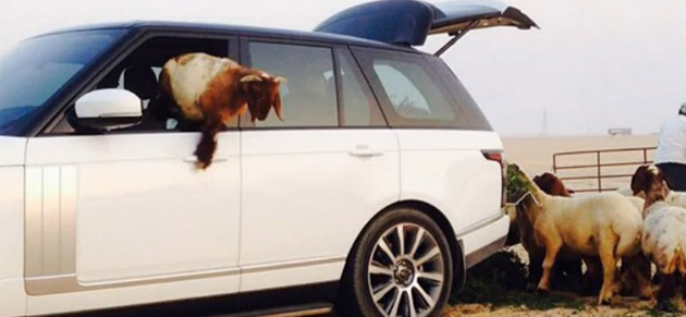 نشر متداولو مواقع تواصل مقطع فيديو يظهر تجمع لبعض الأغنام وهي تتناول وجبتها من العلف داخل سيارة من طراز "رينج روفر".